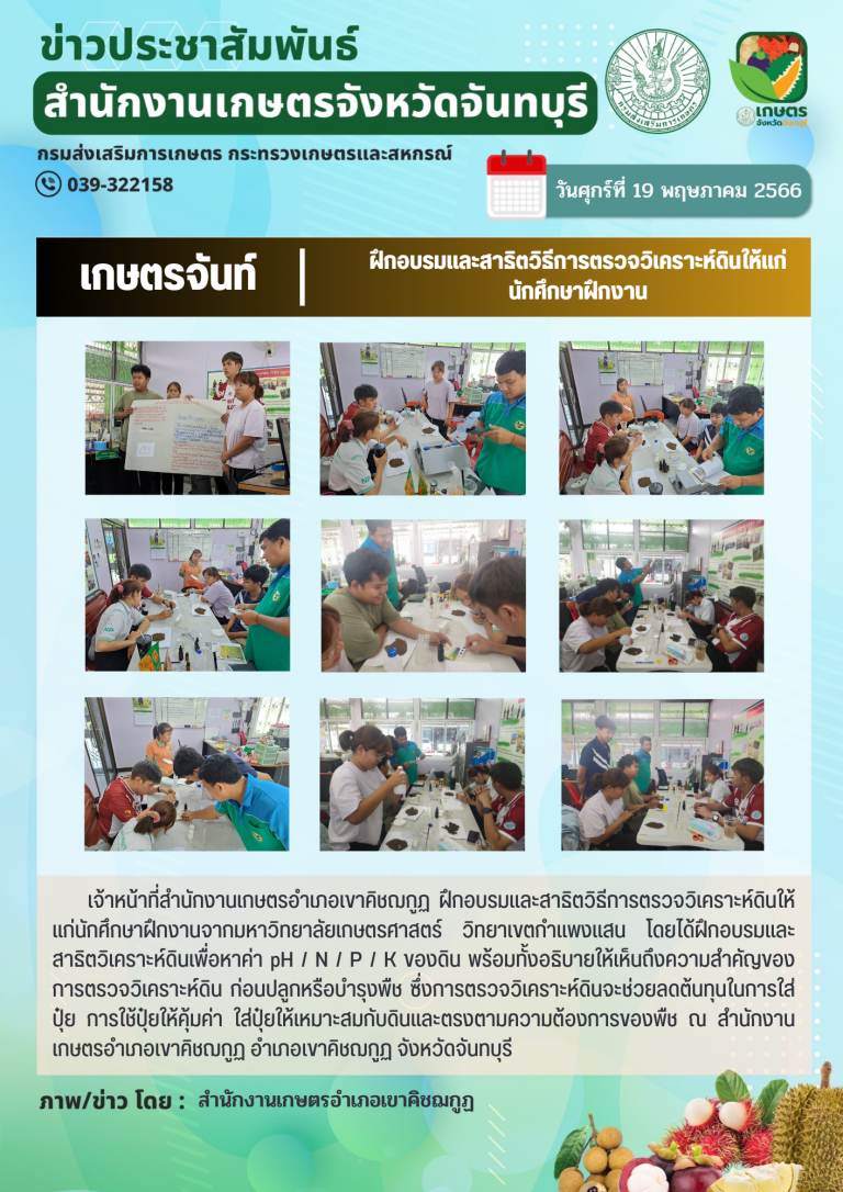 เกษตรเขาคิชฌกูฏ เกษตรเขาคิชฌกูฏ: ฝึกอบรมและสาธิตวิธีการตรวจวิเคราะห์ดินให้แก่นักศึกษาฝึกงาน admin 19 พฤษภาคม 2023