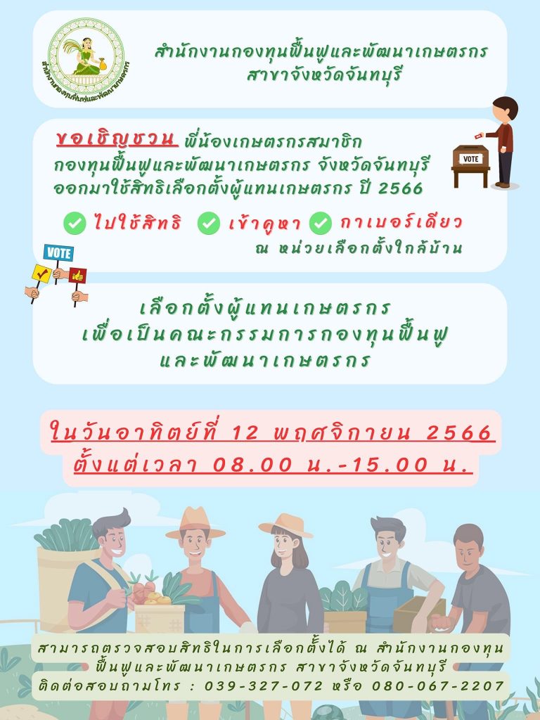 ข่าวประชาสัมพันธ์ เลือกตั้งผู้แทนเกษตรกรเพื่อเป็นคณะกรรมการกองทุนฟื้นฟูและพัฒนาเกษตร จังหวัดจันทบุรี admin 31 ตุลาคม 2023