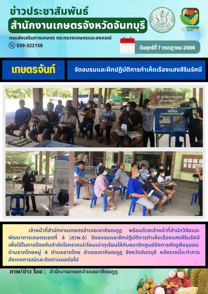 เกษตรเขาคิชฌกูฏ เกษตรเขาคิชฌกูฏ: จัดอบรมและฝึกปฏิบัติการทำเห็ดเรืองแสงสิรินรัศมี admin 7 กรกฎาคม 2023 Continue Reading Previous Previous post: เกษตรเขาคิชฌกูฏ: ร่วมประชุมกับ YSF เข้าคิชฌกูฏNext Next post: เกษตรเขาคิชฌกูฏ: ร่วมประชุมกลุ่มปรับปรุงคุณภาพยางพารา