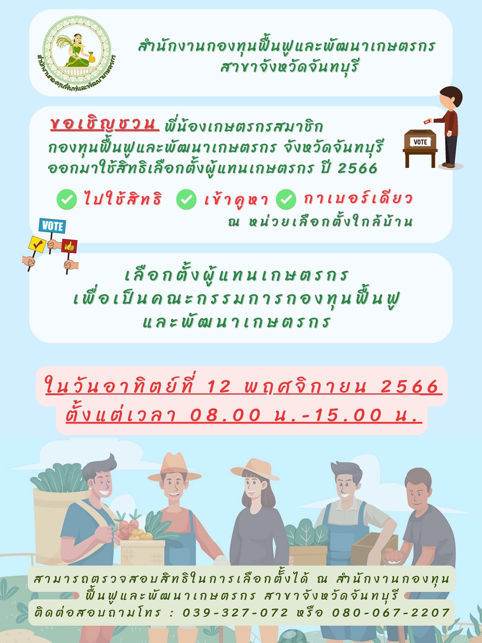 ข่าวประชาสัมพันธ์ เลือกตั้งผู้แทนเกษตรกรเพื่อเป็นคณะกรรมการกองทุนฟื้นฟูและพัฒนาเกษตร จังหวัดจันทบุรี admin 31 ตุลาคม 2023 Continue Reading Previous Previous post: อาการผิดปกติของพืชที่เกิดจากการขาดธาตุอาหารNext Next post: เกษตรเขาคิชฌกูฏ: ลงพื้นที่ตรวจสอบแปลงทุเรียนของเกษตรกรที่เกิดใบเหลืองร่วงเฉียบพลัน